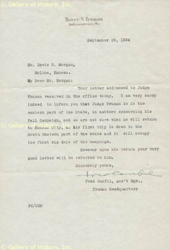FRED CANFIL - TYPED LETTER SIGNED 09/26/1934