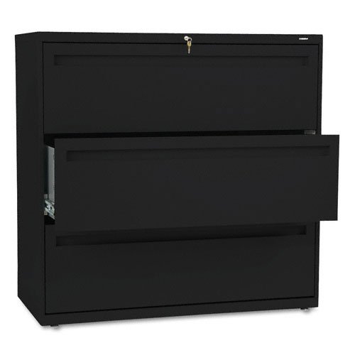 HON Products - HON - Brigade 700 Series Three-Drawer Lateral File, 42w x 19-1/4d x 40-7/8h, Black - Sold As 1 Each - Counterweight included, where applicable, to meet ANSI/BIFMA requirements. - Lock secures both sides of drawer. - Three-part telescoping slide suspension. - Leveling glides adjust for uneven floors. - Mechanical interlock allows only one drawer to open at a time to inhibit tipping.Counterweight included, where applicable, to meet ANSI/BIFMA requirements.Lock secures both sides of drawer.Three-part telescoping slide suspension.Leveling glides adjust for uneven floors.Mechanical interlock allows only one drawer to open at a time to inhibit tipping.HON Products - HON - Brigade 700 Series Three-Drawer Lateral File, 42w x 19-1/4d x 40-7/8h, Black - Sold As 1 Each - Counterweight included, where applicable, to meet ANSI/BIFMA requirements. - Lock secures both sides of drawer. - Three-part telescoping slide suspension. - Leveling glides adjust for uneven floors. - Mechanical interlock allows only one drawer to open at a time to inhibit tipping. . HON Products - HON - Brigade 700 Series Three-Drawer Lateral File, 42w x 19-1/4d x 40-7/8h, Black - Sold As 1 Each - Counterweight included, where applicable, to meet ANSI/BIFMA requirements. - Lock secures both sides of drawer. - Three-part telescoping slide suspension. - Leveling glides adjust for uneven floors. - Mechanical interlock allows only one drawer to open at a time to inhibit tipping.?HON - Brigade 700 Series Three-Drawer Lateral File, 42w x 19-1/4d x 40-7/8h, Black - Sold As 1 EachThree-part telescoping slide suspension. Lock secures both sides of drawer. Mechanical interlock allows only one drawer to open at a time to inhibit tipping. Leveling glides adjust for uneven floors. HON "One Key" interchangeable core removable locks. Color(s): Black; Width: 42 in; Depth: 19 1/4 in; Height: 40 7/8 in. Counterweight included, where applicable, to meet ANSI/BIFMA requirements.Lock secures both sides of drawer.Three-part telescoping slide suspension.Leveling glides adjust for uneven floors.Mechanical interlock allows only one drawer to open at a time to inhibit tipping.