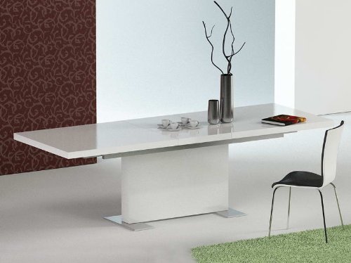 #The Bono Modern White Dining Set comes with two blocks that can be added to the table's length to seat up to 14 people. This two-tier extendable table extends up to 126' to accommodate all your friends and loved ones. High gloss lacquer base and top make for a very chic, modern look, and can be paired easily with other furniture or any accent. Polished satin legs do not only offer sturdy support to the quadratic sturdy high gloss base but also add up to the sophisticated glamor of this very versatile dining table. Color: White Finish: Lacquer Weight: 176 Dimensions: 87"/106"/126"x39"x30" Manufacturer: Modern Furniture by VIG