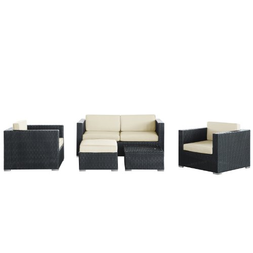 LexMod Malibu Outdoor Wicker Patio 5 Piece Sofa Set In Espresso with White Cushions