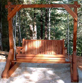 Forever 4 Foot Young Growth Redwood Porch Swing?Made of Young Growth Redwood. The Four-Foot swing is four feet wide by 23 inches high by 28 inches deep. The back is nineteen inches high from the top of the seat to the top of the backrest. The frame is six feet six inches high six-and-a-half-feet wide and the base is four feet deep. . Includes swing frame and hardware. Maintenance free for years of enjoyment. Partially assembled. The redwood frame is made from full-dimension four-by-fours timbers.. Old Growth Redwood shown in picture