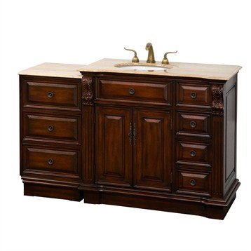 Nottingham 55 Inch Traditional Single Bathroom Vanity with Drawers on Right - Antique Brown?The details on the Nottingham 55 Inch Traditional Bathroom Vanity in Antique Brown are second to none. Wood details include scroll style Acanthus leaf corbels over fluted moulding. The Nottingham vanity family combines classic antique styling with modern modular design with two parts making up this 55 Inch bathroom vanity. This vanity unit has the sink on the left over a two door cabinet, and four drawers on the right. Included is a three-drawer bridge designed for placement either on the left or right side of the vanity. If you would like your sink on the right and the drawers on the left, the Nottingham family is available in multiple configurations to perfectly suit any size bathroom space. Travertine countertop with white porcelain basin is included. Pair this look perfectly in your bathroom with our optional Antique Faucets for a great match. Features Beautifully Hand Crafted Bathroom Vanity with Drawer Bridge 55 Inch Bathroom Vanity consists of 2 modular units Beautiful Travertine Countertops White Porcelain Basin 8" Widespread Faucet Spacing Faucets not included Almost no assembly required Variations in the shading and grain of our natural stone products enhance the individuality of your vanity and ensure that it will be truly unique Dimensions 55 InchW x 22-1/8 InchD x 36 InchH How to handle your counterView Installation Instructions -->